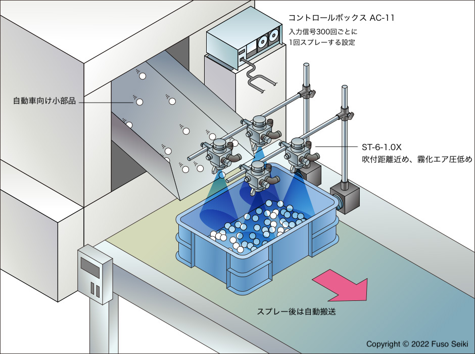 そして製品が300個貯まると、スプレーガンが防錆油を自動で塗布します。