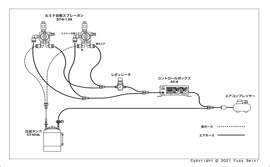 最後に、自動スプレーガン2台への接続方法を説明します。使用に当たって必要なものは、「操作ガイド」の「必要なもの」でご確認ください。スプレーガンはエア入口2本のST-6です。液体の供給方法には圧送タンク、重力式容器、ポンプの3通りがありますが、ここでは圧送タンクを使います。以下に示したのは簡易的な接続の例です。
