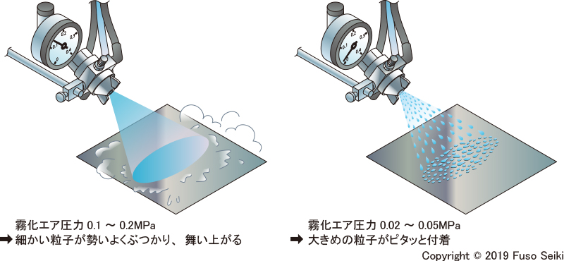霧化エア圧力を高くする(0.1-0.2MPa程度)と、液滴の粒子径は小さくなるため、塗装面はなめらかに美しく仕上がります。ただし、細かく霧化された粒子の多くは対象物に塗着せずに散逸してしまうため、液体の使用量が増えます。