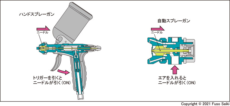 ハンドスプレーガンと自動スプレーガンは、構造的にどう違うのでしょうか?一言で言うと、トリガーでオン・オフするのがハンドスプレーガン、コンプレッサーエアでオン・オフするのが自動スプレーガンです。下の断面図をご覧ください。