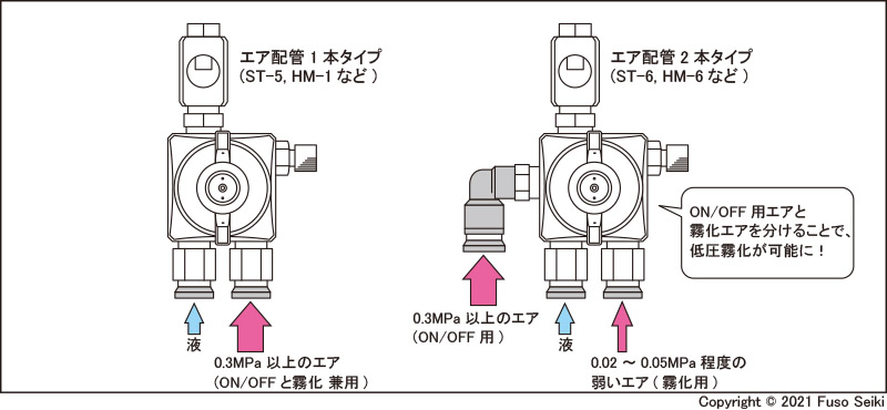 すでに説明しましたように、バルブを開放するには0.3MPa程度のエア圧力が必要です。そのためエア入口1本タイプは、必然的に0.3MPa程度の高いエア圧力で霧化を行うことになり、飛散が避けられません。飛散が望ましくない場合、エア入口2本タイプを選んでください。