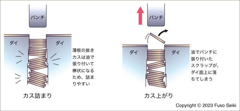 カス上がりの場合も、油のべたつきが悪さをします。どれだけ穴にカスがたまっても、カスが自分の力で材料の上にジャンプすることはありません。パンチが上がる際に、油でベタついたカスを一緒に引き上げるからこそ、カス上がりが発生するのです。