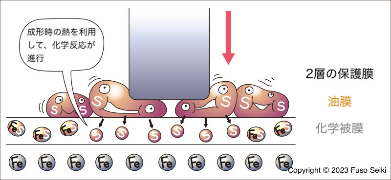加工油は材料表面に油膜を張ることで、材料と金型が直接こすれ合うのを防ぎます。さらに、油に含まれる硫黄やリンなどの成分は材料と化学反応を起こし、磨耗や焼き付きに強い化学被膜を形成します。この二重の保護膜が、高圧のストレスにさらされる材料を守ってくれるのです。