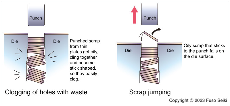 One of the causes of clogging of holes with waste and scrap jumping is excessive application of lubricant. If the thin plate scrap falls downward a little at a time, there will be no clogging of holes. However, the oily scrap clumps together in the drop hole and often becomes stick shaped. Clogging occurs because this scrap builds up in the narrow drop hole.