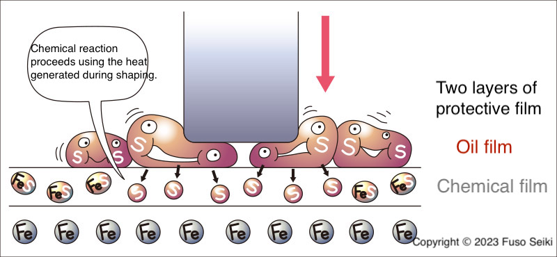 Metalworking lubricant prevents direct rubbing between the material and the die by forming an oil film on the surface of the material. In addition, components such as sulfur and phosphorus contained in the lubricant cause chemical reactions with the material, forming a chemical film that is resistant to abrasion and seizures. This double protective film layer protects the material from exposure to high pressure stress.