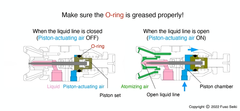 The O-ring is coated with grease to ensure the piston chamber remains sealed and allow the piston to retract smoothly when air pressure enters the chamber. If the grease is removed during cleaning, however, the O-ring will have too much friction and prevent the piston set from retracting properly. That is why you should always apply new grease to the O-ring after cleaning.