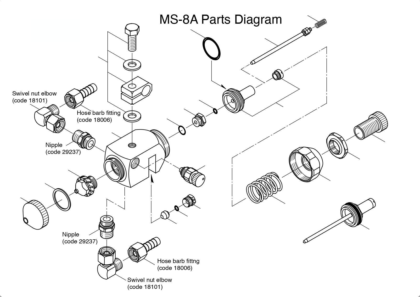 The nipples (code 29237) and two types of fittings (code 18101, 18006) are sold separately.